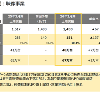 ニコンの2025年4~9月期は会社全体では営業赤字となってしまいました。映像事業は減収減益ですが、Z5IIやZ50IIはよく売れてはいるようで、前回予想比では上振れとなっています。関税や為替に加えて、製品単価が下がったのも減収減益の要因の1つのようで、確かに少し前まではより高単価のZ8やZfなどが売れ筋でしたね。