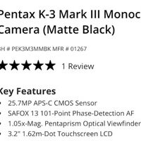 ・The Pentax K-3 Mark III Monochrome camera is listed as discontinued at B&H